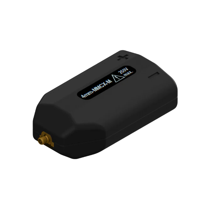 The 4mm-MMCX-M is a test point adapter that allows direct connection of PMK's BumbleBee and HORNET series high-voltage differential probes to test points with an MMCX male connector.